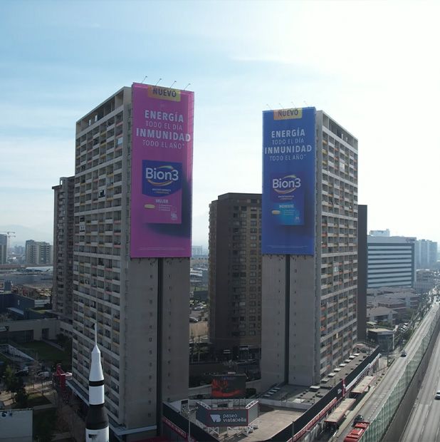 Imponente Building Wrap compuesto por dos telas mesh de 13×34 mts cada una, ubicado en el cruce de Vicuña Mackenna